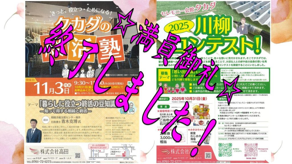11月3日(月)に開催されましたタカダの終活塾ですが、皆様のおかげで無事終了いたしましたのでご報告させていただきます。当日申込みのお客様も含めて満席となり大盛況となりました。今後も様々なイベントを企画して参りますので宜しくお願い致します。...