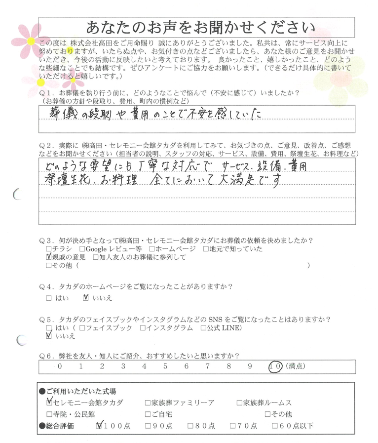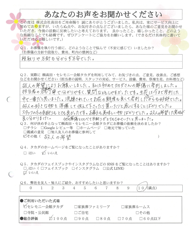 何から何まで高田さんに相談にのっていただいて助かりました。40年以上お葬式をしたことがなかったので、最近のやり方や風習などわからないことばかりでした。納棺もきれいになりうれしかったです。よくしていただいて感謝しています。